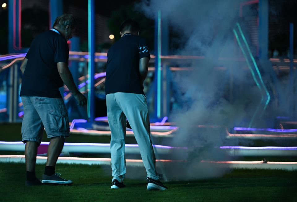 8月16日,赛场工作人员对一架坠落冒烟的无人机进行处理。新华社记者 张博文 摄