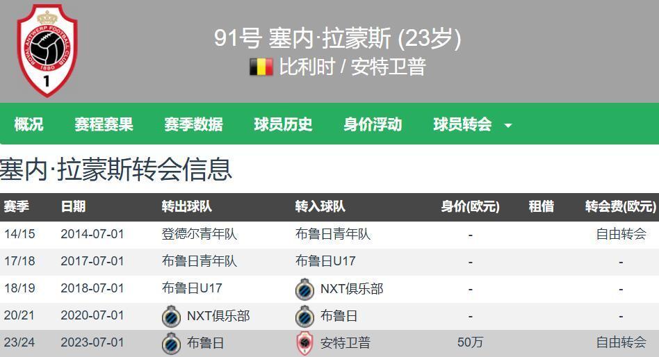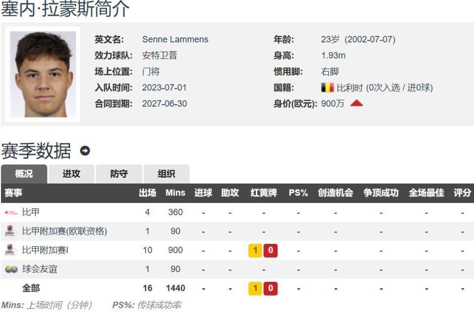 KY体育官方网站拉门斯出自比甲豪门布鲁日青训,之后于2023年夏窗自由身加盟安特卫普,至今各项赛事64场,取得12次零封,丢了86球,场均丢1.34球。
